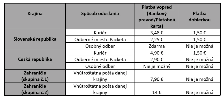 Zahraničie (skupina 1) – pri objednávke v hodnote nad 80 € (s platbou vopred bankovým prevodom), doručenie na adresu. Neplatí pri platbe kartou cez platobnú bránu, ani dobierkou.