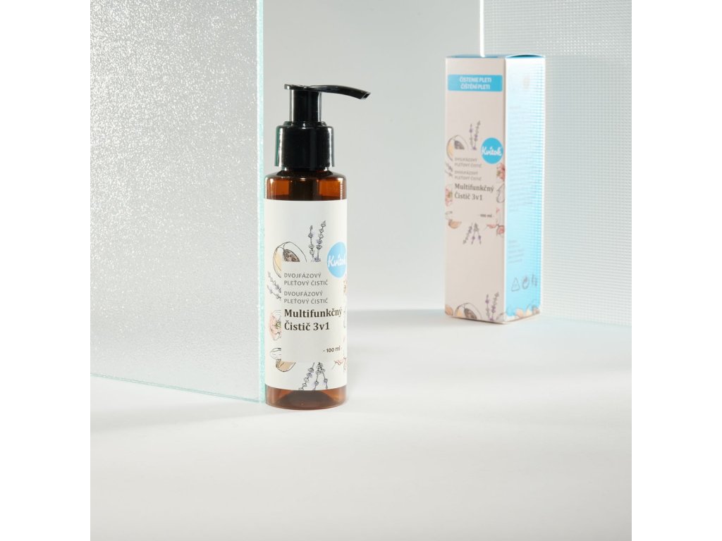 2-fázový multifunkčný čistič 3v1 je zložený z 2 fáz: olejovej a vodnej. V olejovej fáze sa rozpúšťajú nečistoty rozpustné v tukoch (napr. odpadové látky, ktoré vylučuje naše telo cez pokožku) a vo vodnej fáze sa rozpúšťajú nečistoty rozpustné vo vode (napr. nečistoty z vonkajšieho prostredia).