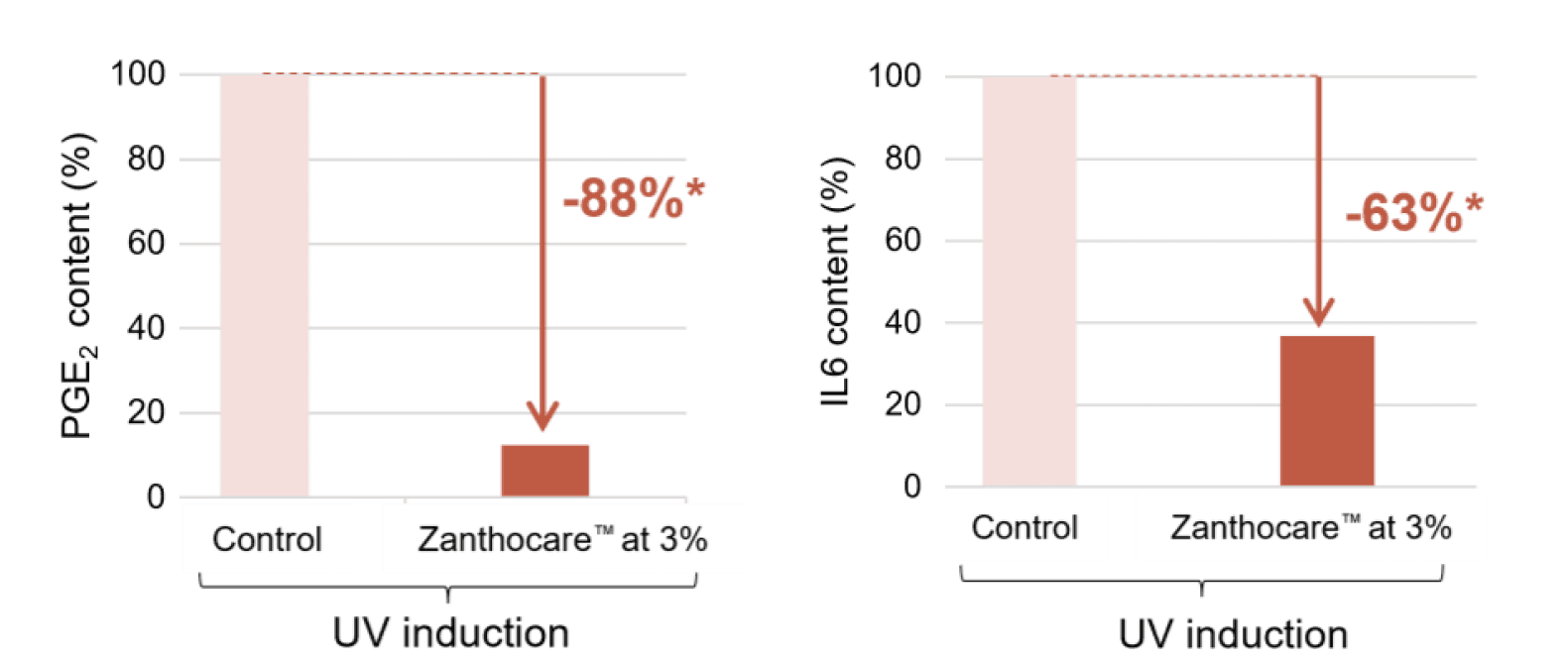 Oxidačný stres zohráva rozhodujúcu úlohu pri starnutí ľudskej kože a pri poškodení kože. Mechanizmy vnútorného (chronologického) a vonkajšieho (foto) starnutia zahŕňajú najmä tvorbu reaktívneho kyslíka (ROS) oxidačným metabolizmom a ultrafialovým (UV) svetlom. Tvorba ROS je teda kľúčovým mechanizmom, ktorý vedie k starnutiu pokožky. “Oxidačné starnutie” zahŕňa poškodenie DNA, zápalové reakcie, zníženú tvorbu antioxidantov a tvorbu matricových metaloproteináz (MMP), ktoré degradujú kolagén a elastín v dermis. Zanthocare™ má vysokú antioxidačnú schopnosť a tvorbu ROS významne znižuje (o 69%). Sledovaný bol tiež vplyv na tvorbu zápalových markerov po ožiarení UV žiarením a testovaním bolo preukázané, že tvorba prostaglandínu E2 (zodpovedný za začervenanie, opuch a bolesť v mieste zápalu) klesá o 88% a Interleukínu 6 o 63%, oproti kontrolným vzorkám.