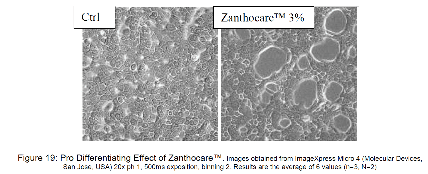 Okrem toho štatisticky významne znižuje produkciu kožného mazu o 38% a eliminuje rast Cutibacterium acnes, ktoré sú spájané s tvorbou akné. Testovanie hydratačného efektu preukázalo, že Zanthocare™ už pri veľmi nízkej koncentrácii (0,26%) zvyšuje syntézu kyseliny hyalurónovej o 208%. Zároveň sa významne podieľa na zvýšení diferenciácie keratinocytov, čo vedie k vyššej ochrannej schopnosti epidermis a lepšej hydratácii.
