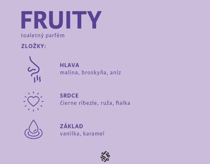 Uniknite do sveta fantázie a zábavy s hravou vôňou Fruity, ktorá prináša optimizmus a vyvolá skvelú letnú náladu aj počas chladnejších dní. Ovocné tóny malín a broskyne pozvoľne prechádzajú do kvetinového srdca doplneného prenikavou vôňou ríbezlí a dopĺňajú tak vanilkovo-karamelový základ.