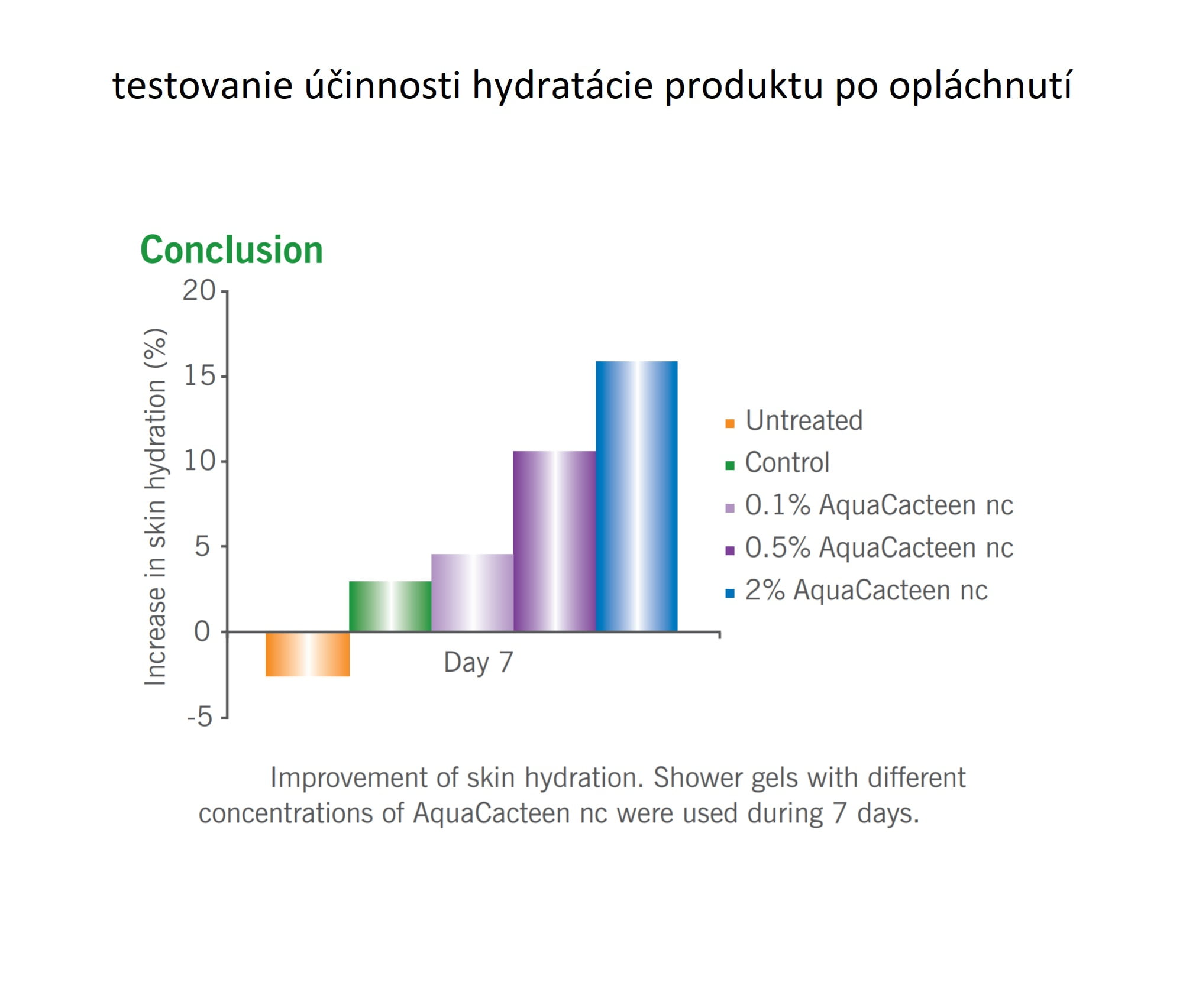 V klinickej štúdii boli testované sprchové gély s rôznymi koncentráciami tejto aktívnej látky, hydratácia bola meraná pomocou Corneometra a výsledky sú zobrazené v nasledujúcom grafe. Počas jedného týždňa sa zvýšila hydratácia pokožky o 16%.