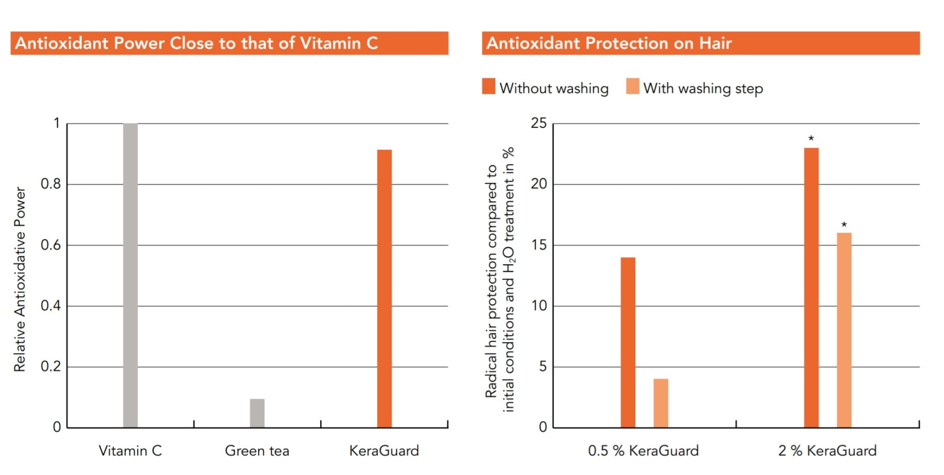 KeraGuard– extrakt z plodov Cezalpínie – Tara a klíčkov slnečnice, chráni vlasy pred teplom, mestským znečistením a UV stresom, opravuje chemicky ošetrené vlasy, zabraňuje poškodeniu po chemickom farbení vlasov a vyblednutiu farby vlasov, obnovuje odolnosť vlasov. Vykazuje antioxidačné vlastnosti porovnateľné s vitamínom C a je efektívny pri ochrane vlasu pred polutantami, čo preukazujú aj klinické štúdie. Vlastnosti zachytávania radikálov boli hodnotené pomocou Radical Hair Protection Method (RHP), ktorá je založená na meraní spektra elektrónovej spinovej rezonancie (ESR) melanínu v ľudských vlasoch. UV ožarovanie vlasov vytvára voľné radikály, ktoré sú vychytávané melanínovým polymérom a to vedie k reorganizácii jeho elektrónovej štruktúry, ktorá vysiela odlišný melanínový signál. The zvýšenie signálu je priamo úmerné dávke UV žiarenia; čiže oxidačnému poškodeniu na vlase. Výsledky ukázali, že KeraGuard výrazne zvýšil ochranu vlasu pred UV žiarením a vykázal antioxidačnú ochranu aj po umytí.
