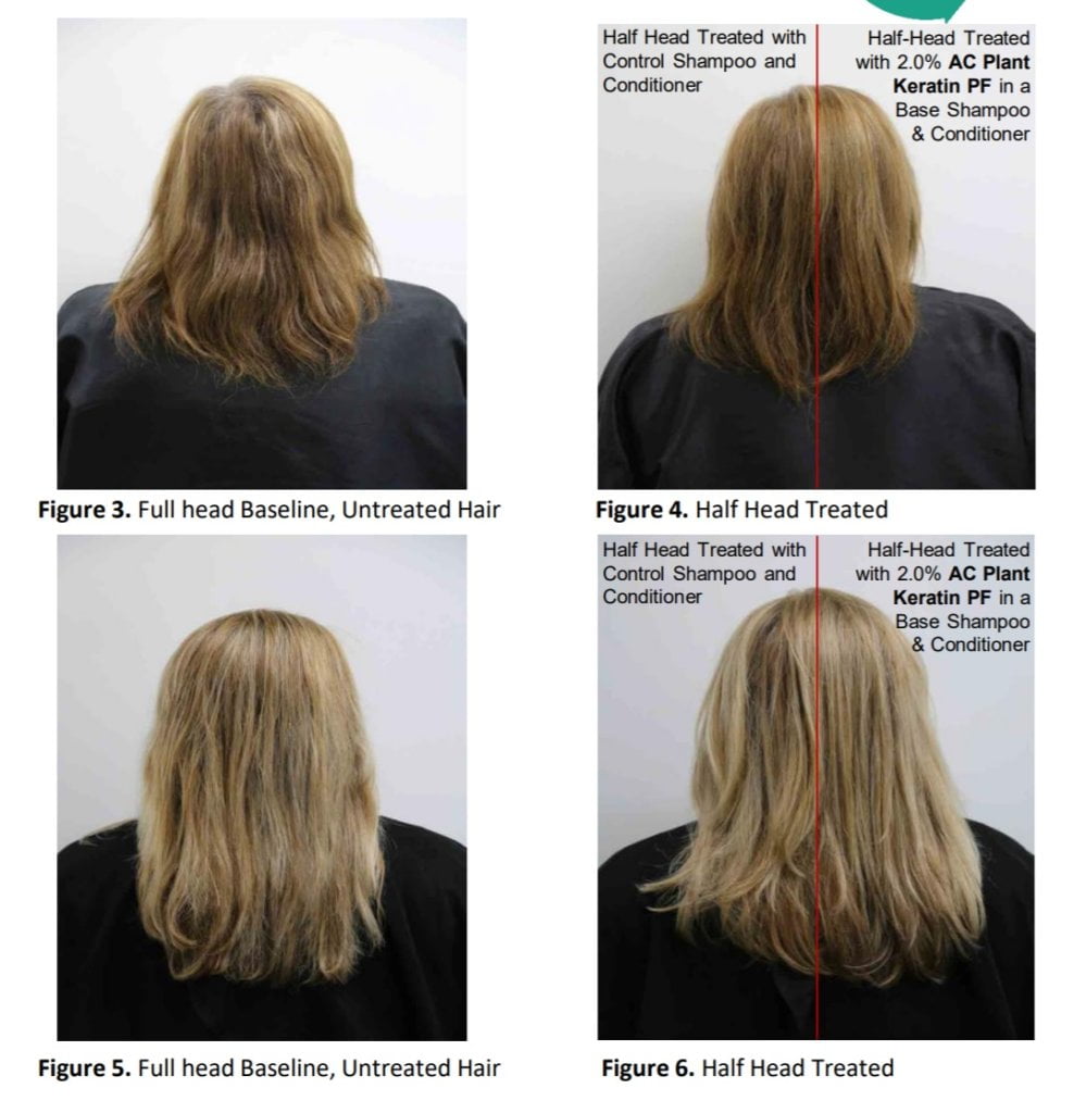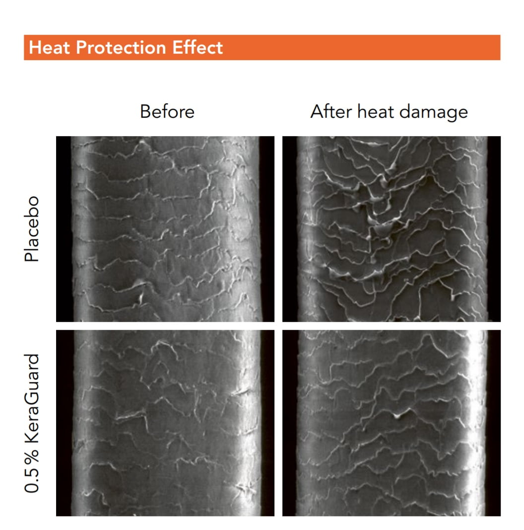 Skúmaná bola aj ochrana vlasu pred poškodením tepelnou úpravou. Testované vlasy boli podrobené ôsmim cyklom tepelného poškodenia spôsobeného žehličkou (Rowenta® Elite model Look) pri teplote 200ºC počas 1 minúty a 30 sekúnd. Stupeň poškodenia vlasov bol hodnotený Elektrónovou mikroskopiou (FEI Quanta 400 FEG_ESEM/EDAX Pegasus X4M) na začiatku a po ôsmich cykloch tepelného poškodenia. Výsledky preukázali, že KeraGuard účinne chráni vlasovú kutikulu pred tepelným poškodením v porovnaní s placebom. Snímky s vysokým rozlíšením ukázali aj výraznú zmena na povrchu vlasov pred a po zahrievaní a v prítomnosti alebo bez prítomnosti KeraGuard: po zahriatí vlasov ošetrených placebom sa zdvihlo bol v niektorých oblastiach dokonca pozorovaný rozpad kutikuly a objavili sa rozstrapkané okraje, pričom vlasy ošetrené prípravkom s obsahom KeraGuard boli chránené a šupinatá vrstva bola plochejšia (nebola rozstrapkaná).