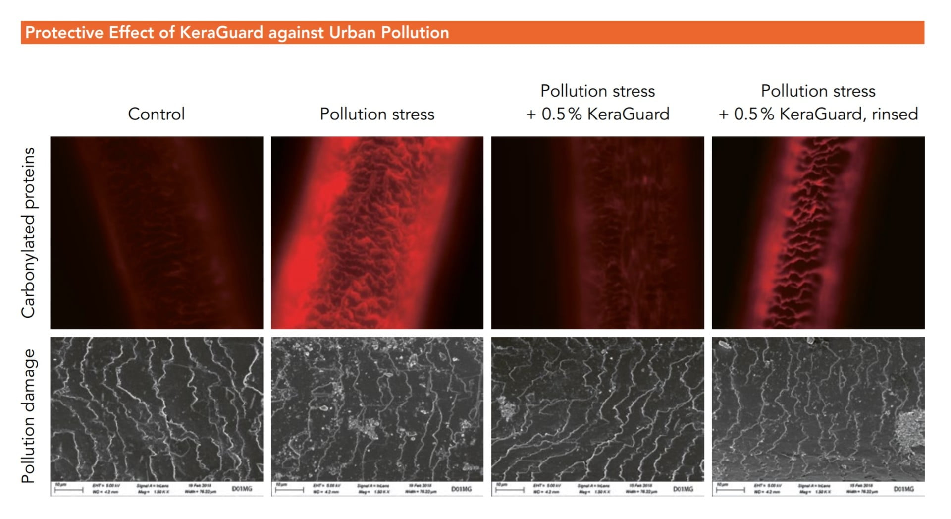 Znečistené ovzdušie je priamo v kontakte s našimi vlasy a prispieva k ich každodennému poškodeniu. Hlavnými zdrojmi sú priemyselné spaľovanie (naftové výfukové plyny a uhlie), doprava a stavebné činnosti. Vo vzduchu sa nachádzajú veľmi jemné častice (PM), ktoré v kombinácii s vystavením UV žiareniu spôsobujú oxidačné reakcie vo vlasovom proteíne, čo vedie k poškodeniu a krehkosti vlasov. Výsledky testovania ochrany vlasu pred polutantami ukázali významné zníženie karbonylovaných proteínov vo vlase ošetrenom KeraGuard, dokonca aj po opláchnutí. Snímky z elektrónovej mikroskopie ukázali, že na povrchu ošetreného vlasu sa ukladá menej týchto častíc, preto KeraGuard účinne chráni vlasy pred mestským znečistením.