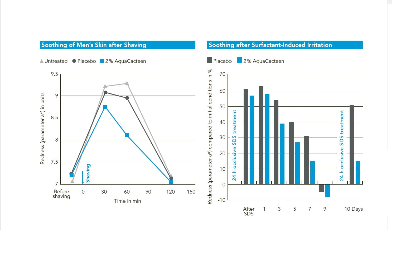 Sledovaný bol tiež upokojujúci efekt na iritovanú pokožku – krátkodobý aj dlhodobý, po holení, a tiež po vystavení pokožky pôsobeniu SDS (sodium dodecyl sulfate – tenzid). Začervenanie pokožky bolo odmerané chromametrom a následne bol aplikovaný na začervenanú pokožku produkt s obsahom 2% účinnej látky. Výsledky preukázali, že Aquacacteen 1 hodinu po holení významne dokázal zmierniť začervenanie a taktiež bol preukázaný dlhodobý upokojujúci efekt a rýchlejšie zotavenie pokožky po vystavení pokožky SDS, v porovnaní s placebom.