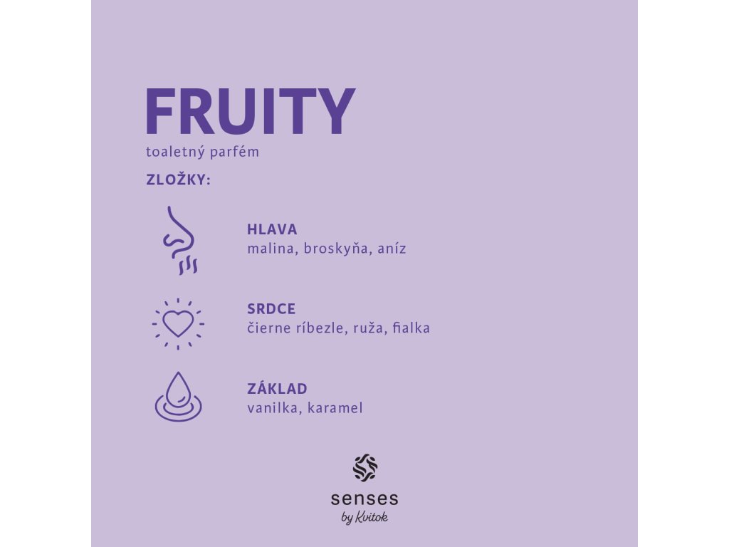 Naša kolekcia s označením SENSES by KVITOK® prináša potešenie nielen pre vaše telo, ale aj pre vaše zmysly. Vzácne prírodné vône kombinujú čisté esenciálne oleje a rastlinné extrakty podľa princípov umenia parfumérstva pre vytvorenie nezabudnuteľného zážitku pri používaní. Vďaka dokonale vybranej a vyváženej kombinácii vôní sa zamilujete už na prvé ovoňanie. Olejový parfém s praktickým roll-on aplikátorom je tvorený olejovým základom z jemných rastlinných olejov (jojobového a hroznového), ktoré zabezpečia distribúciu a postupné uvoľňovanie esenciálnych olejov na pokožke. Intenzita a výdrž vône ale záleží od typu pokožky, pretože zložky vône reagujú s látkami na pokožke u každého inak a vytvárajú tak charakteristickú individuálnu arómu. Charakteristika vône FruityNÁŠ TIP: Pre trvácnejšiu vôňu vašej pokožky kombinujte s ostatnými produktami z kolekcie FRUITY.