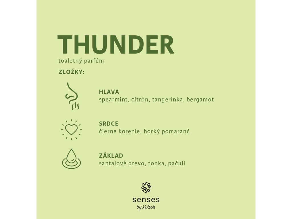 Naša kolekcia s označením SENSES by KVITOK® prináša potešenie nielen pre vaše telo, ale aj pre vaše zmysly. Vzácne prírodné vône kombinujú čisté esenciálne oleje a rastlinné extrakty podľa princípov umenia parfumérstva pre vytvorenie nezabudnuteľného zážitku pri používaní. Vďaka dokonale vybranej a vyváženej kombinácii vôní sa zamilujete už na prvé ovoňanie. Toaletný parfém (Parfum de Toilette)/Parfémová voda (Eau de Parfum)/EdP/Esprit de Parfum To všetko sú názvy, pod ktorými je možné naše parfémy vďaka koncentrácii vonných zložiek pomenovať. EdP podľa parfumérskeho označenia má zvyčajne koncentráciu cca 15-25% - jednotlivé koncentrácie sa ale zväčša prelínajú a nie je striktne uvedené, akú koncentráciu môžeme presne zaradiť do ktorej skupiny. Vďaka vyššej koncentrácii vonnej zložky tak zväčša parfémové vody majú výdrž cca 5-8 hodín. Intenzita a výdrž vône ale záleží od typu pokožky, pretože zložky vône reagujú s látkami na pokožke u každého inak a vytvárajú tak charakteristickú individuálnu arómu. Podľa príslušnej normy je na základe množstva vonnej kompozície tento výrobok označený ako Eau de Parfum (EdP), prípadne aj menej známy Esprit de Parfum (ESdP), čo je zriedka používaná koncentrácia medzi EdP a parfumom. Charakteristika vône Thunder