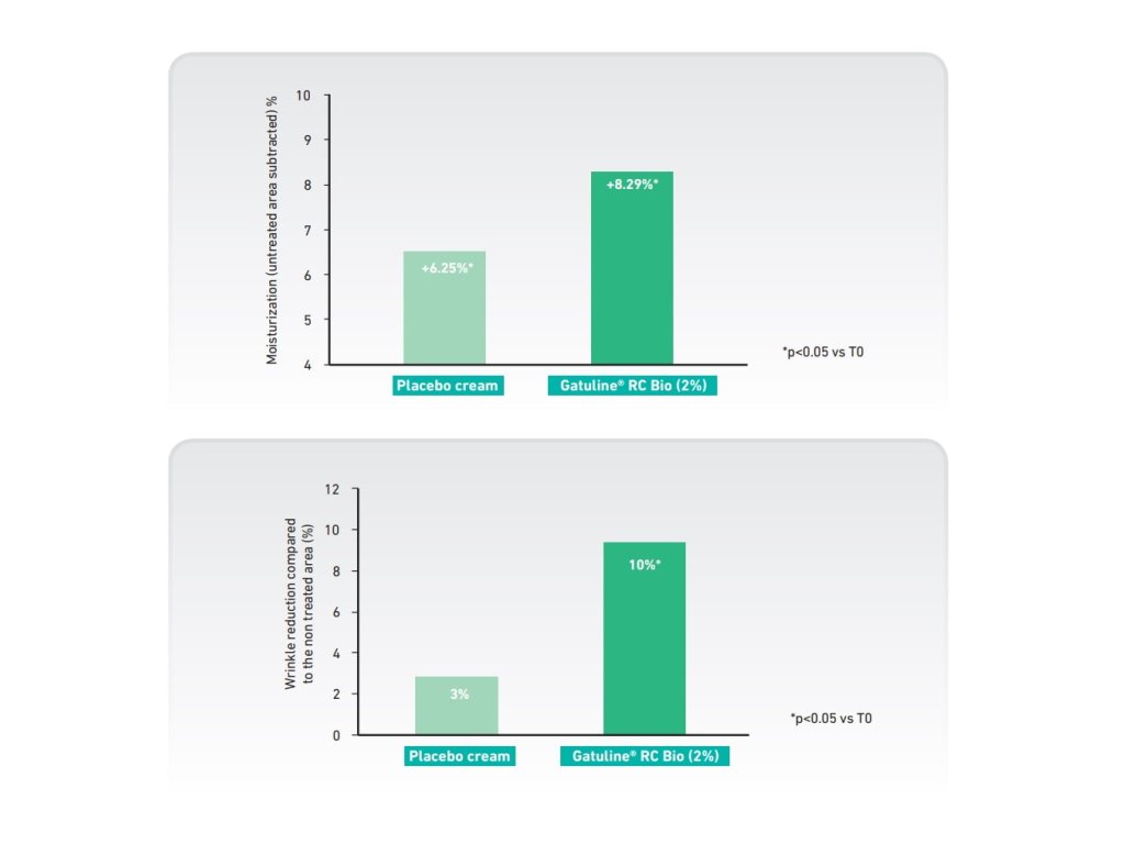 In vivo testovanie preukázalo, že Gatuline® RC Bio po 12-tich hodinách od aplikácie zlepšuje v porovnaní s placebom hydratáciu kože o 30% a redukuje jemné linky o 10%.