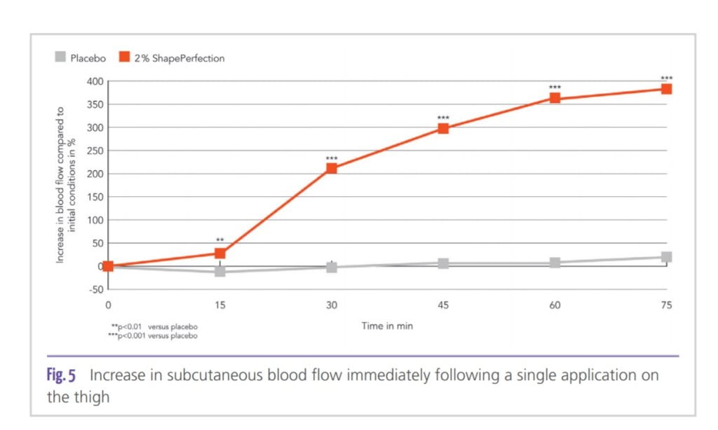 Pre znásobenie tohto účinku je v telovom kréme použitý aj extrakt z čili papričiek – kapsaicín a semienok bielej horčice (ShapePerfection), ktorý aktivuje mikrocirkuláciu, znižuje zadržiavanie vody, „vyprázdňuje“ bunky tukového tkaniva premenou tuk akumulujúcich adipocytov na bunky, ktoré dokážu aktívne spaľovať tuky. Tieto účinky sú preukázané na základe klinických štúdií in vivo počas 8-tich týždňov (ženy vo veku 21-54 rokov, II a III stupeň celulitídy, aplikácia 2 krát denne):