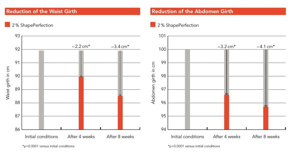 - -3,2 cm v oblasti brucha po 4 týždňoch, celkovo -4,1 cm v oblasti brucha po 8 týždňoch